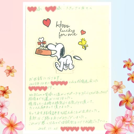 私たちWeBCon横浜店は、会員様お一人おひとりの人生に寄り添いながら、ご縁をつなぐお手伝いをさせていただいております。こうしてご成婚後も幸せなお便りをいただけることが、何よりの励みです。